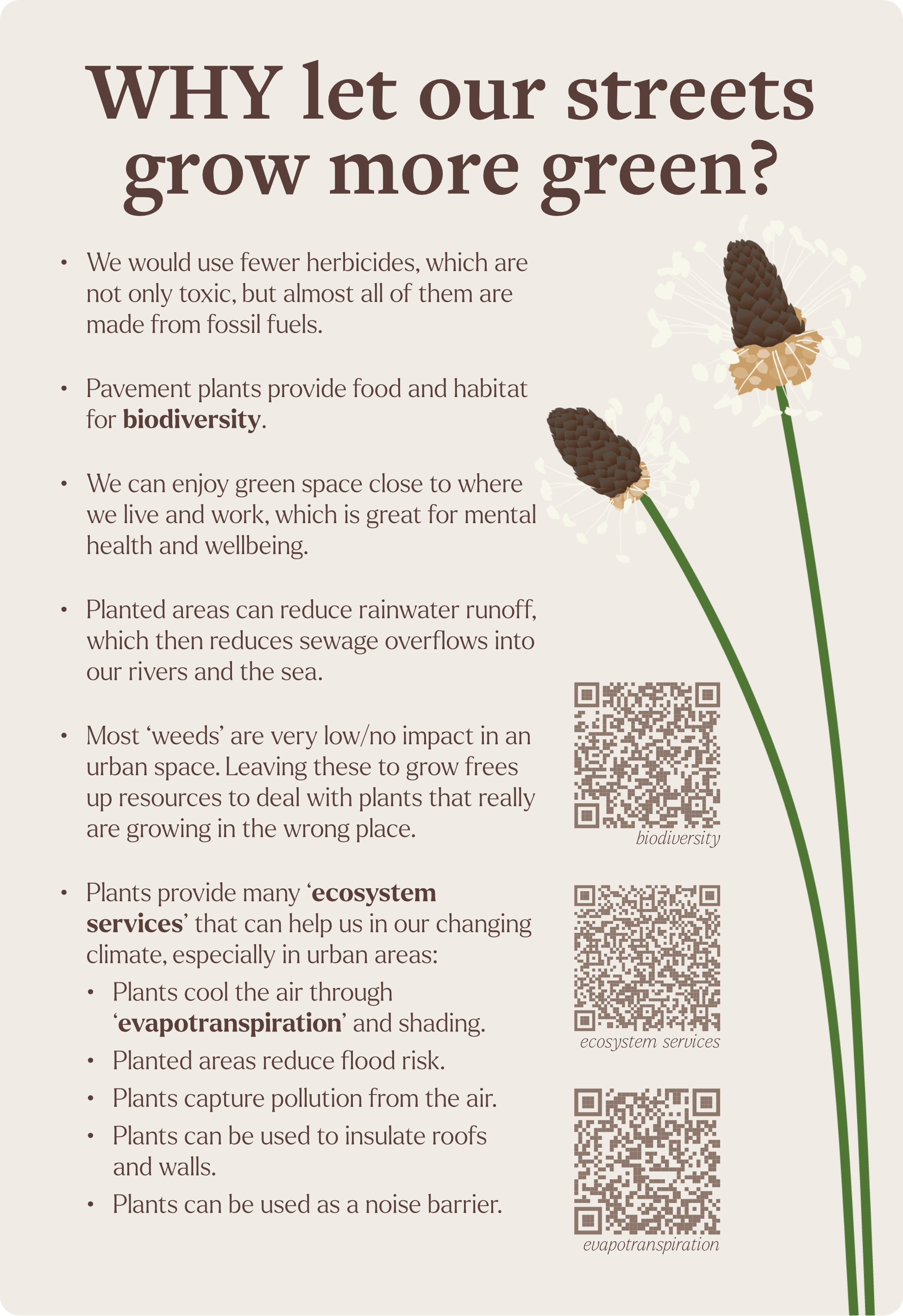 Illustration and layout for posters and leaflets to display and hand out at in-person sessions on the topic of urban greening. Text written in collaboration with Dr Megan Wakefield.